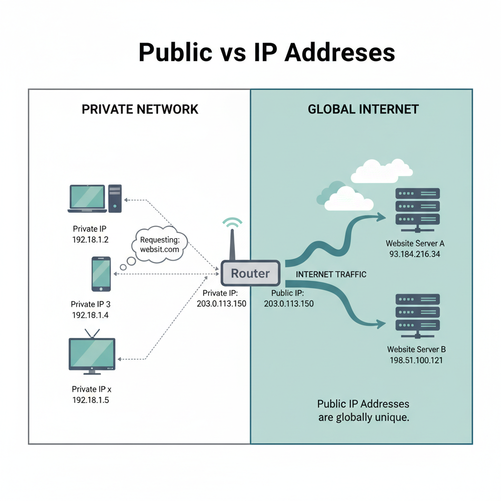 Private IP Addresses are used within a private network such as your office network. Devices on the same local network use these to communicate with each other. They are not visible to the public internet. Think of them as room numbers inside your house.